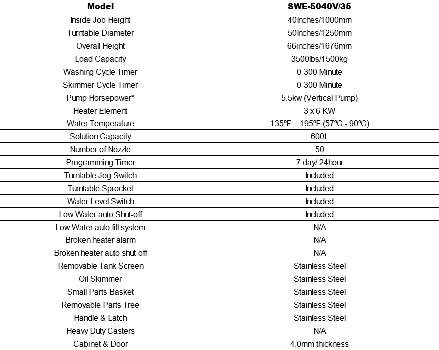 . Internal dimensions: 50” turntable; 40” job height; 3500 lbs. max loading capacity