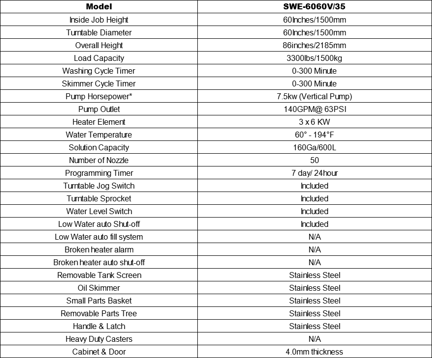 . Internal dimensions: 60” turntable; 60” job height; 3300 lbs. max loading capacity