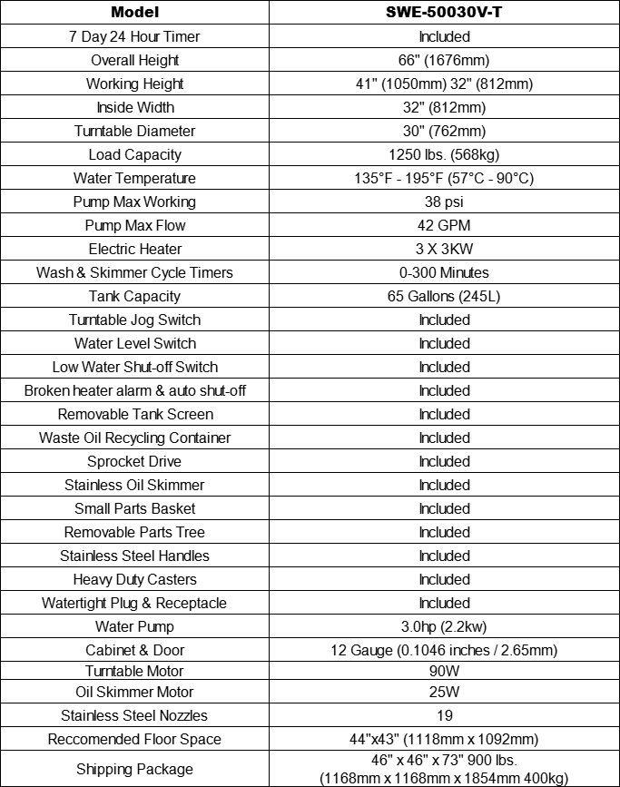 Ideal for transmission and automotive repair shops, the SWE-50030V-T has all the features the professional demands. Cut-away sides at the bottom of the machine allow engine crane access to the 1250 lb. Capacity wash turntable for easy loading and unloading. A 12-gauge (0.1046”) heavy-duty steel door and cabinet construction, ease of operation, and all the great features make the SWE-50030V-T the choice for professionals.