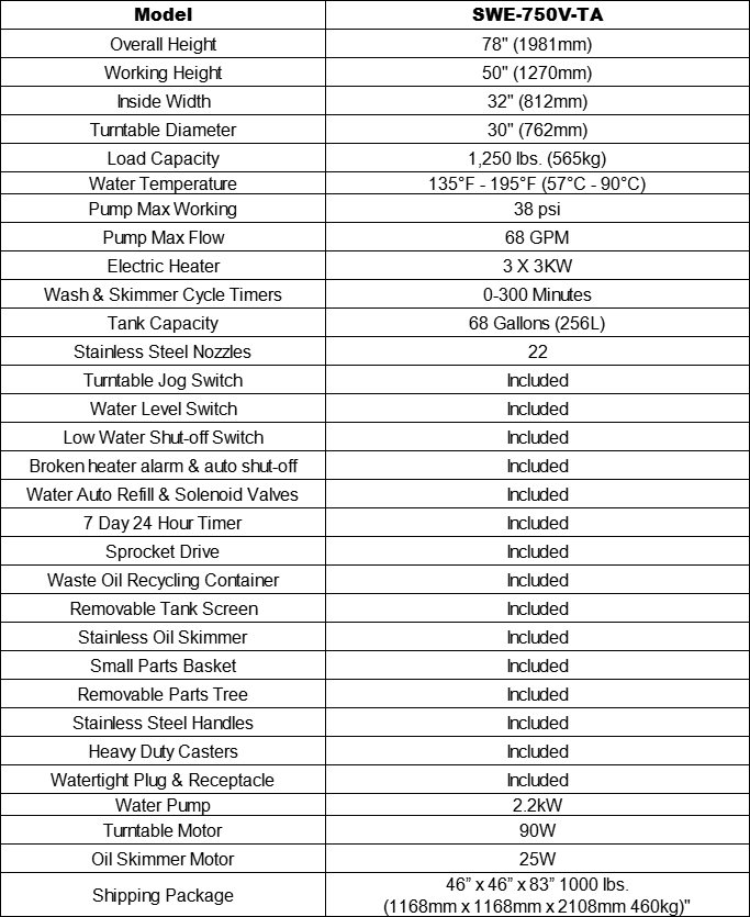 SWE-750V-TA has all the features the professional demands. Cut-away sides at the bottom of the machine allow engine crane access to the 1250 lb. Capacity wash turntable for easy loading and unloading. With a 54” inside height the SWE-750V-TA is made for everything from small engine parts to light duty diesel blocks.