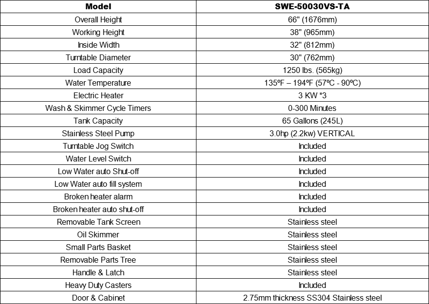 . Internal dimensions: 30” turntable; 38” job height; 1250 lbs. max weight capacity